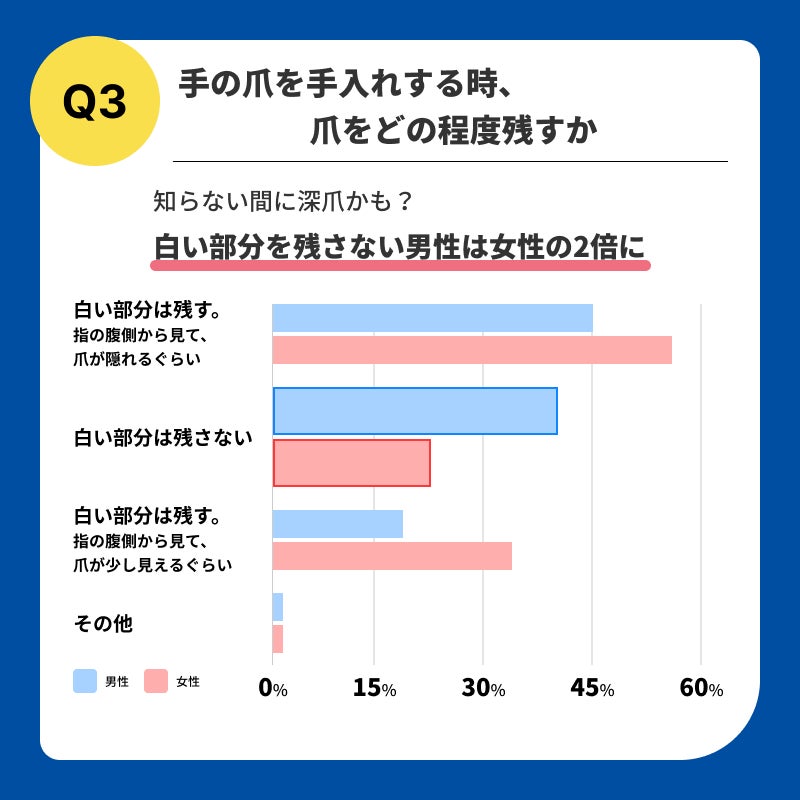 また、実際に爪を切る時にどの程度残すかについては、男性では「白い部分は残さない」と答えた人が女性の約2倍という結果になりました。
