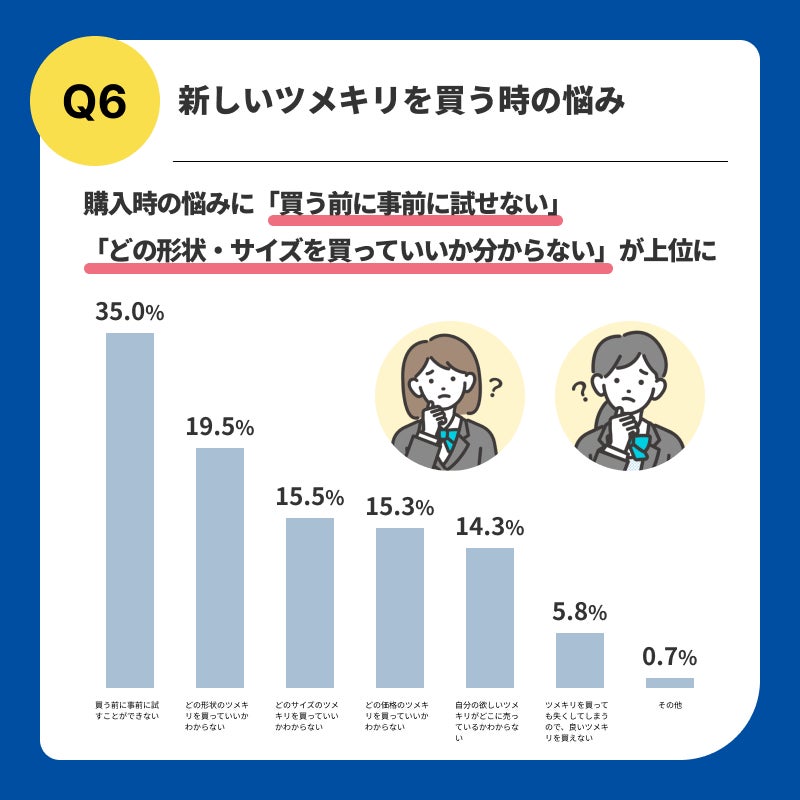 新しいツメキリを購入する際の悩みについて調査したところ、男女問わず「買う前に事前に試せない」「どの形状・サイズを買っていいか分からない」という意見が上位に挙がりました。