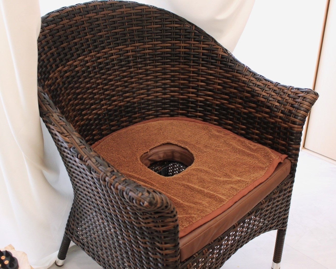 具体的には、専用のマントを被った状態で穴の開いた椅子に座り、その下からよもぎを蒸してその蒸気を20~30分程度当て続けるという方法です。