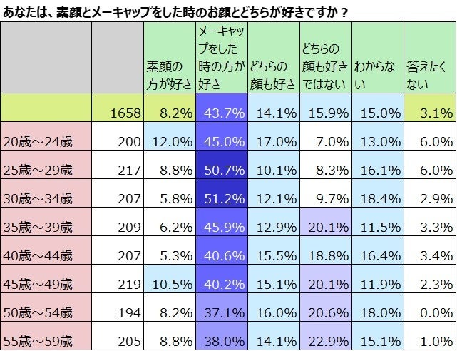 これを年齢別に見てみました。「メーキャップをした時の方が好き」と答えた割合は、20歳~39歳まであまり変わらず約5割で44歳~59歳は約4割でした。「どちらの顔も好き」と答えた割合は25歳~29歳で10.1%と少し少ないですが、それ以外の年代は12~17%であまり差がないことがわかりましたが、「どちらの顔も好きではない」は年代によって差が大きく20歳~34歳は1割未満ですが35歳~59歳は約2割に上りました。