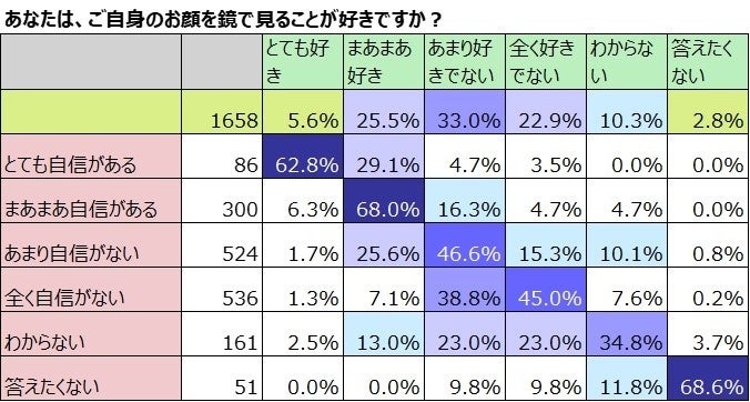 「鏡で自分の顔を見るのが好き」と「メークに自信がある」はリンクする。