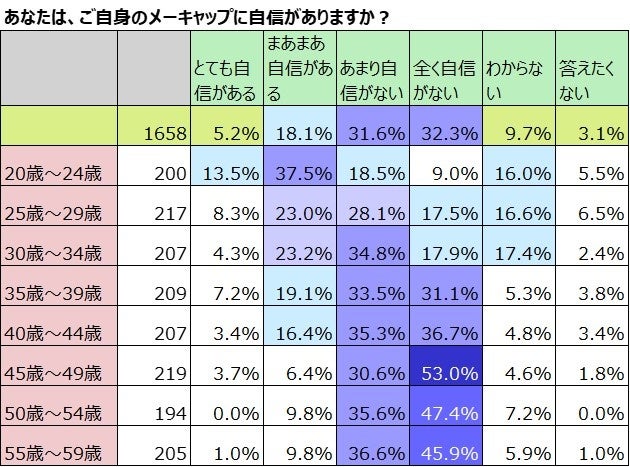 次に、ご自身のメーキャップへの自信について聞きました。全体では「とても自信がある」5.2%「まあまあ自信がある」18.1%でそれらを合わせた「自信がある」のは23.3%でした。これを年齢別に見てみると、「とても自信がある」が最も多いのは20歳~24歳で13.5%。「まあまあ自信がある」37.5%と合わせると51%と半数を超える人が自信があると答えており「自信がない」のは27.5%と自信がある人の半分程度です。年齢を重ねるほど自信がある人の割合が減っていく傾向があり、25歳~29歳で自信がある人が31.3%、自信がない人が45.6%となり、自信がない人の割合が上回ります。25歳~39歳は自信がある人が約3割程度ですが、一方で自信がない人の割合は30歳~34歳で52.7%と半数を超え、35歳~39歳で64.6%と増えていきます。40歳~44歳では自信がある人は19.8%と2割を下回り、自信がない人が72%と7割を超えます。45歳~59歳は自信がある人も自信がない人も割合にはあまり変化がなく、自信がある人が約1割、自信がない人が約8割でした。