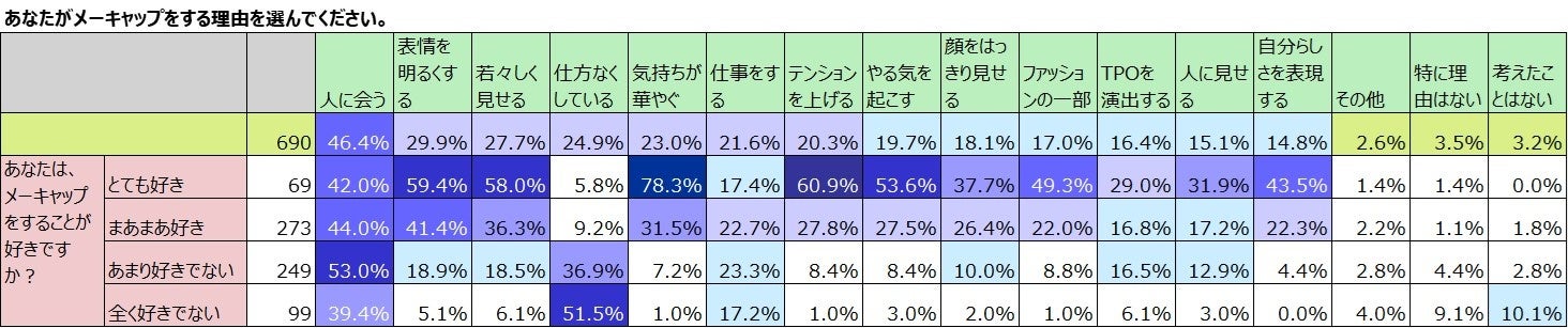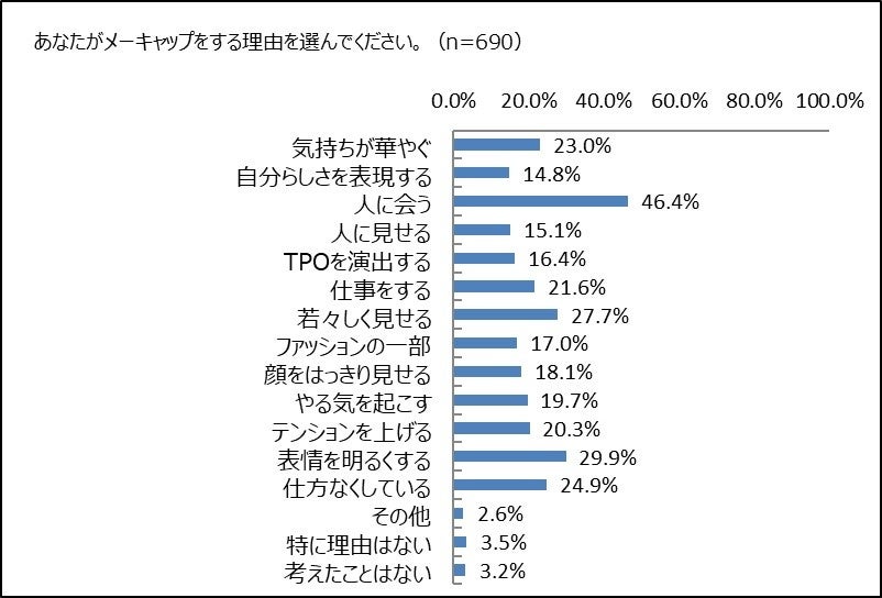 全体のメーキャップをする理由の1位は年齢、好き嫌いを問わず「人に会う」で約5割。