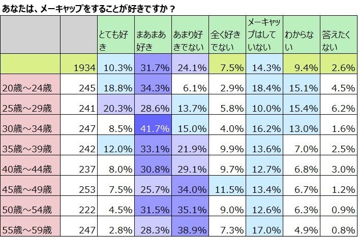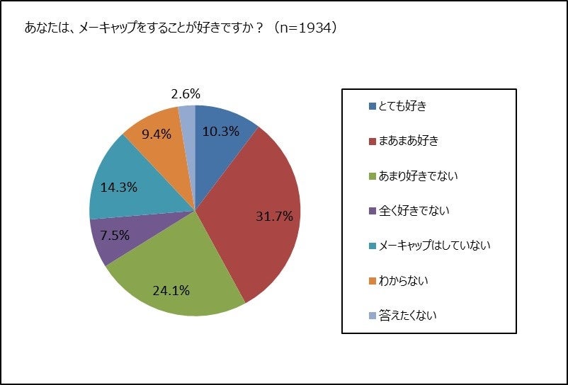 全国の20歳~59歳の1,934名の女性に、メーキャップをすることが好きか否か聞きました。全体では「とても好き」10.3%と「まあまあ好き」31.7%を合わせた42%が好きと答えました。メーキャップをしていないと答えた女性は14.3%でした。