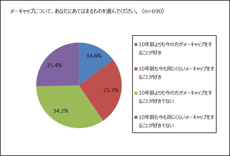 素顔よりもメーキャップをした時の顔の方が好き、アラサーが多く半数以上。40代以上の女性の3割超、10年前の方がメーキャップが好きだった。