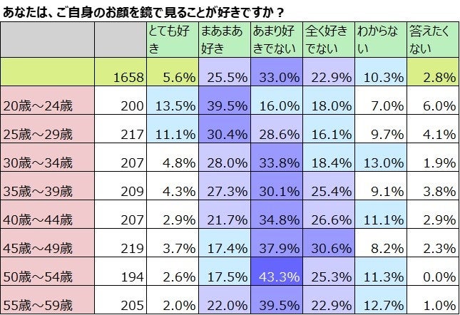 メーキャップをしていると答えた1,658名の女性に鏡で自分の顔を見ることが好きか否か聞きました。全体では「とても好き」が5.6%、「まあまあ好き」が25.5%で合わせて31.1%と約3割の人が好きと答えています。反対に嫌いな人は「あまり好きではない」33.0%「全く好きではない」22.9%で合わせると55.9%と6割に近いことがわかり、好きな人の割合よりも2倍近くも多いことがわかりました。
