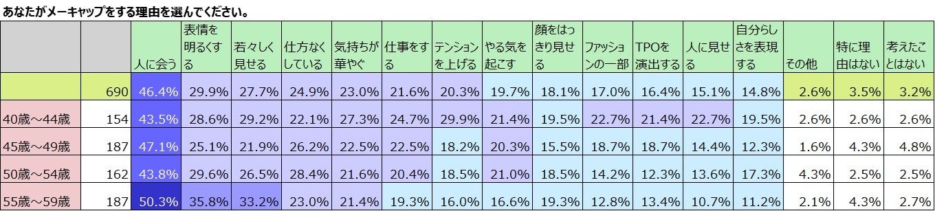 40歳以上のメーキャップをしている690名の女性にメーキャップをする理由を選んでもらいました。複数選択のため、合計が100%にはなりません。全体で見てみると1位は「人に会う」が46.4%と圧倒的でした。続く2位は「表情を明るくする」で29.9%。3位は「若々しく見せる」で27.7%でした。