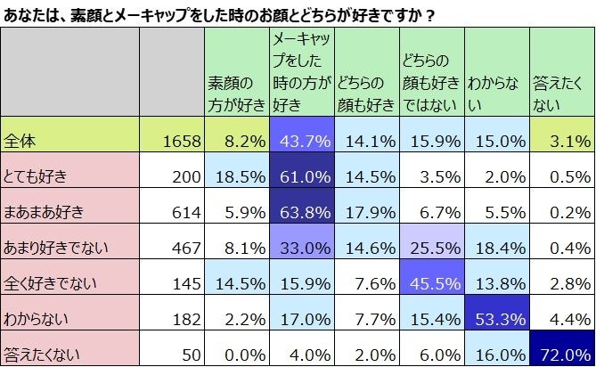 これをメーキャップの好き嫌いとかけ合わせました。メーキャップをすることが好きな人は、「素顔の方が好き」も18.5%と最も多く、「メーキャップをした時の方が好き」は61%です。「まあまあ好き」と答えた人は「メーキャップをした時の方が好き」と答える割合が最も多く63.8%でした。メーキャップをすることが「全く好きでない」の人は「素顔の方が好き」が14.5%と高い一方、「どちらの顔も好きではない」も45.5%と多いことがわかりました。