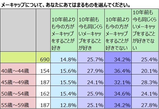 40歳以上のメーキャップをしている女性690名にメーキャップに対する意識について10年前と今を比べてあてはまるものを選んでもらいました。全体では、「10年前よりも今の方が好き」と答えたのは14.8%。年齢で見ると40歳~54歳はほとんど差がありませんが55歳~59歳になると12.8%と少し少なくなります。「10年前も今も同じくらい好き」は全体では25.7%。年齢による差はないと言えます。「10年前よりも好きでない」は全体で34.2%。これは、40歳~44歳が最も多く、36.4%と4割近い人が選んでいます。このことからも、メークの曲がり角が45歳前後であることが想像できます。「10年前も今も同じくらい好きでない」は25.4%でした。