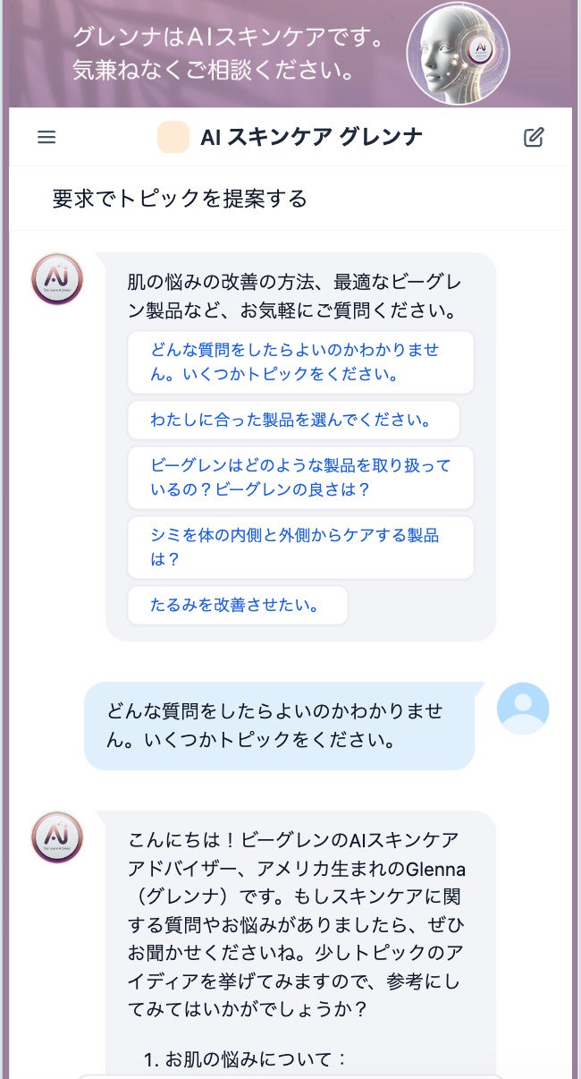 「AI × スキンケア」の新たな挑戦!AIスキンケアアドバイザーで実現する新しい買い物体験。ビーグレンの新サービス「グレンナ」が全国70店舗で展開
