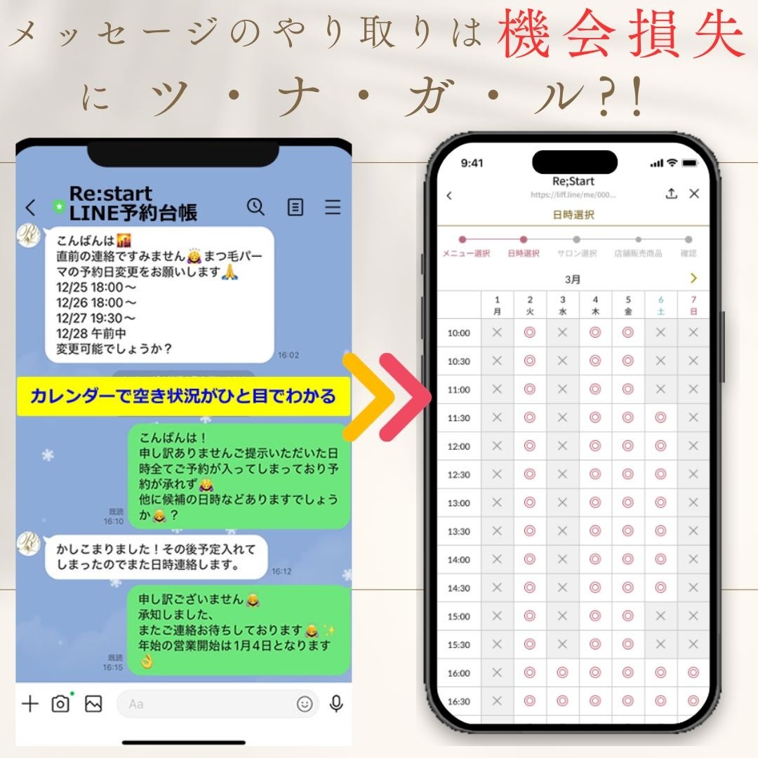 お客様が抱えるストレスはサロンの空席/空室状況がサロンへ問合せしないとわからないという事です。サロンの空席/空室状況がカレンダーから一目でわかるだけで、お客様のストレス軽減につながり、リスタートを導入したサロンは施術だけに集中できることで、毎月の売上拡大につながります。お客様は自身のLINE画面から操作でき10秒~15秒で予約が確定できるので、いままでのやり取り時間の短縮できるのでお客様の顧客満足度向上にもつながります。また前日にはお客様と施術者にも通知が届くので、予約忘れ防止としてもご活用頂けます。