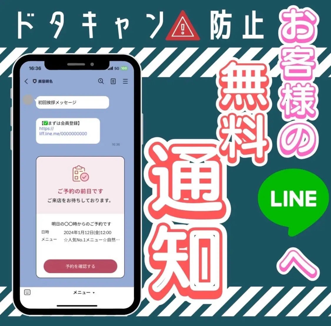・お客様のLINEへ予約日の前日に「ご予約の前日」メッセージが無料で送信されます。お客様の予約忘れや、ドタキャン防止につながります。