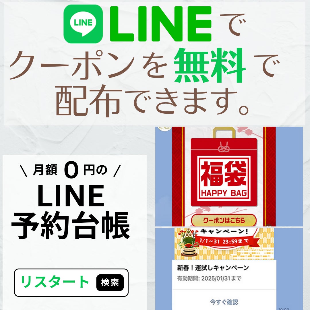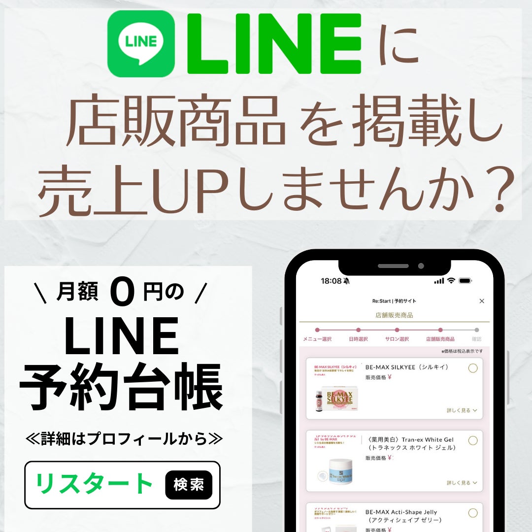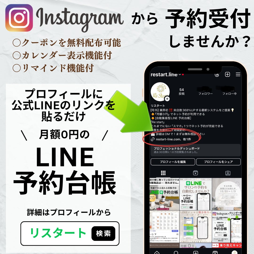 ・Instagramのプロフィールに「サロン公式LINEURLリンク」を貼る事で、リスタートと連動して予約を承る事ができます。毎月の広告費をかけずに新規のお客様を獲得することが可能です。