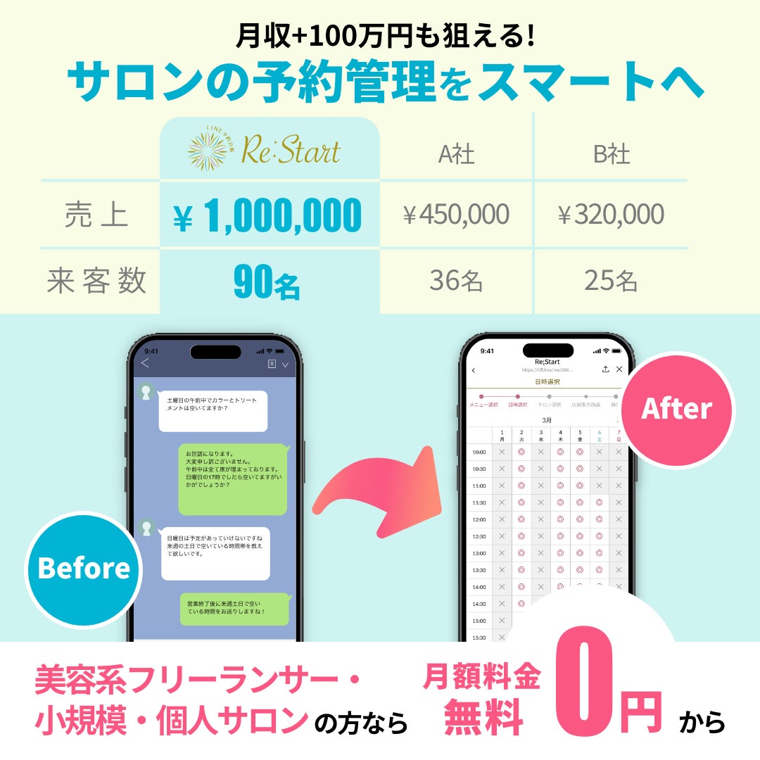 リスタートでは、空席/空室のカレンダー予約システム以外にも前日リマインドメッセージ機能、電子カルテ機能、売上管理データ、店販商品販促ツール、自店以外のシェアサロン登録/利用などさまざまなサービス提供が月額基本料が0円でご利用頂けます。