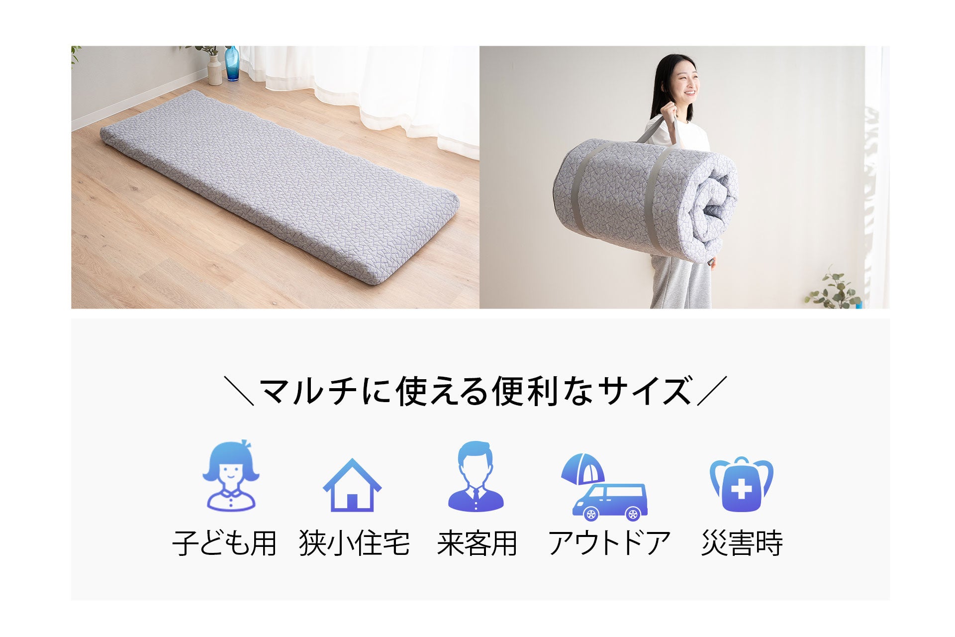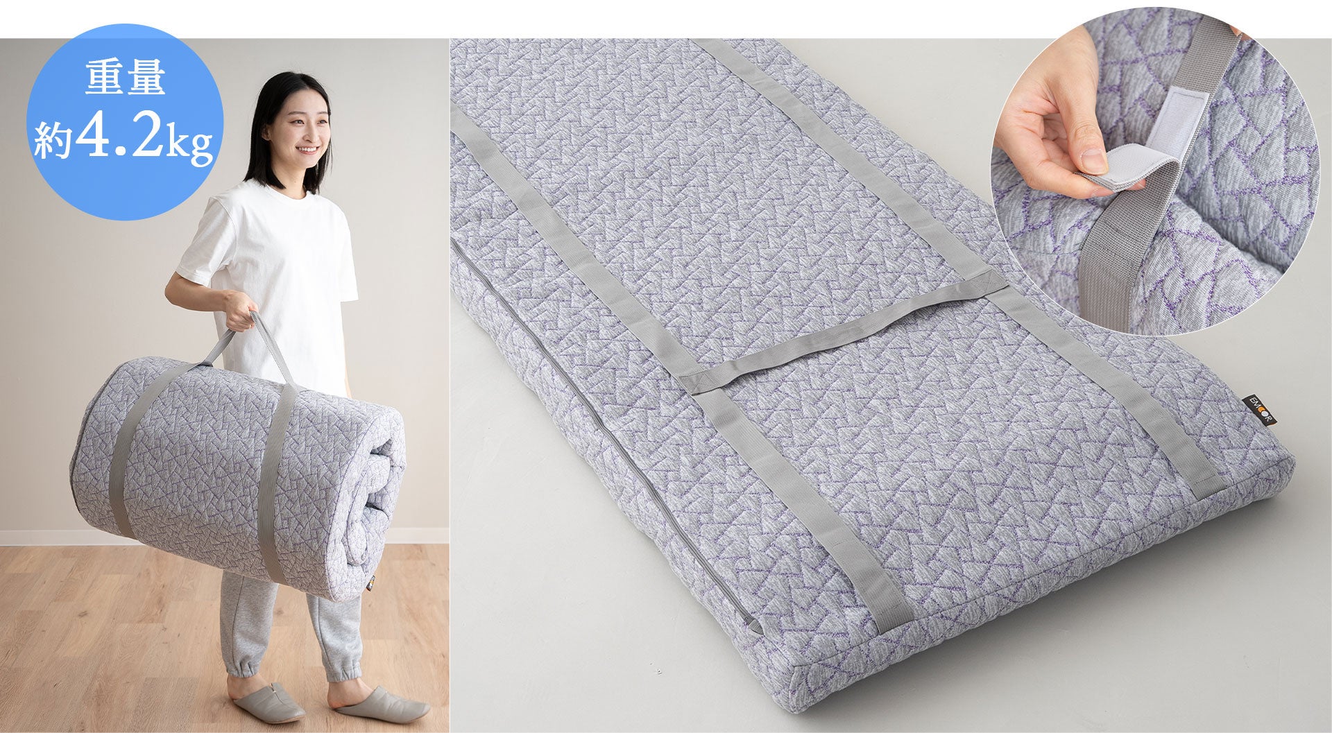 使わない時は丸めて収納バンドでとめるだけ。バンドは本体についているので、なくなる心配もありません。収納時は取っ手が付いているので持ち運びにも便利です。持ち運び便利なロールマットレスは、アウトドアや車中泊、防災対策など幅広いシーンで活躍します。