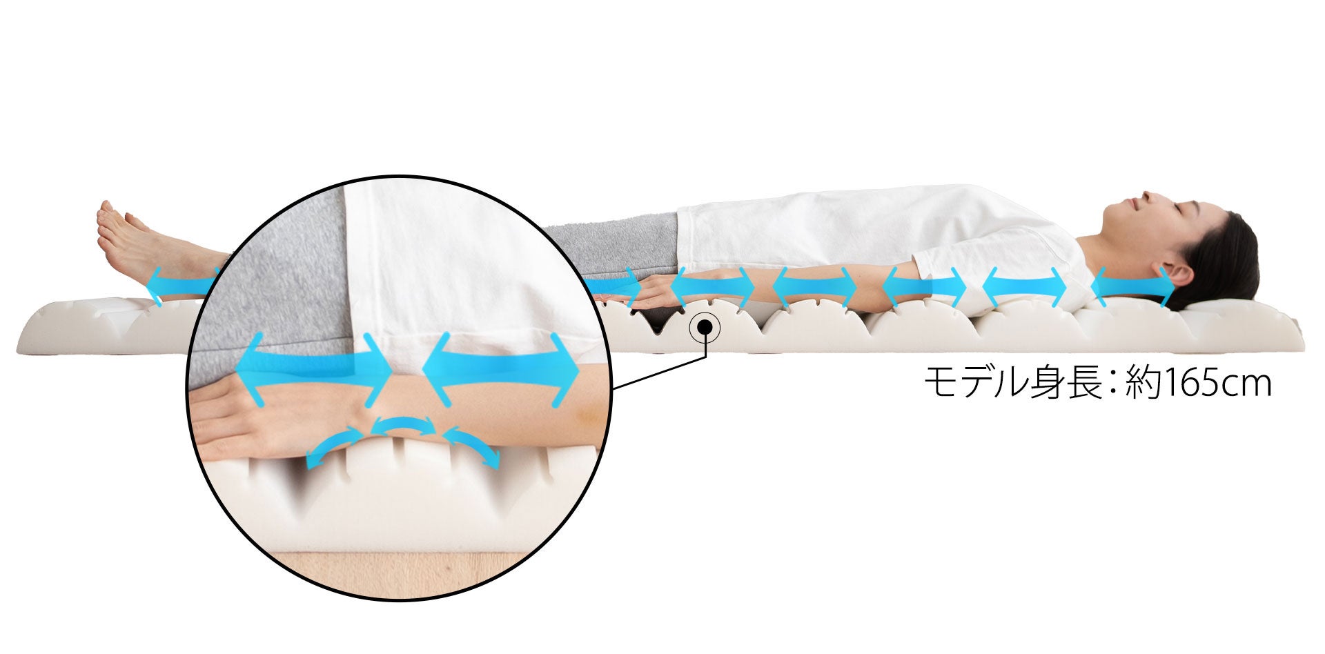アーチ形状が、カラダに触れる面積を最小限にし、点での圧力、面での圧力に対してそれぞれ違った支え方をします。