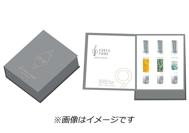 また、香水3種のミニサイズをセットにした初回生産限定版も同時発売。こちらのBOXも大塚 愛さんが監修したデザインとなっており、落ち着いたグレー地にゴールド箔を印した高級感ある仕上がりになっています。