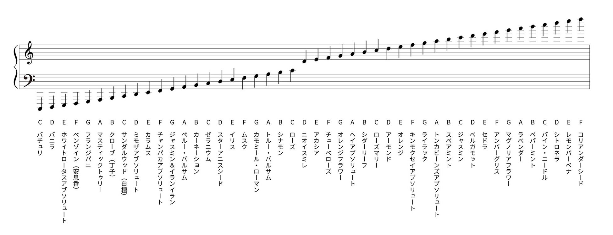 19世紀後半にイギリスの化学者でもあった調香師セプティマス・ピエスによって考案された、46種類の香料を音階に当てはめたもの。揮発性の高い香りは高音に、低い香りは低音に割り当てられ、和音やオクターブ(高さの違う同じ音)ごとに心地良い香りになるよう設計されています。