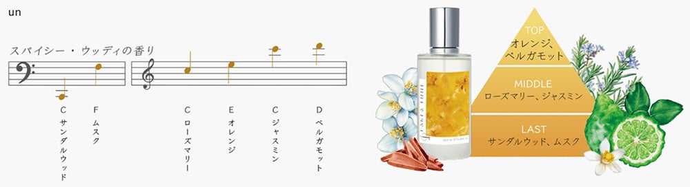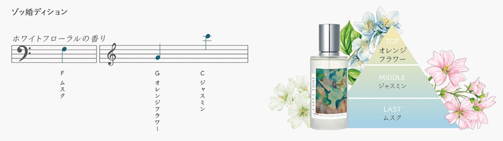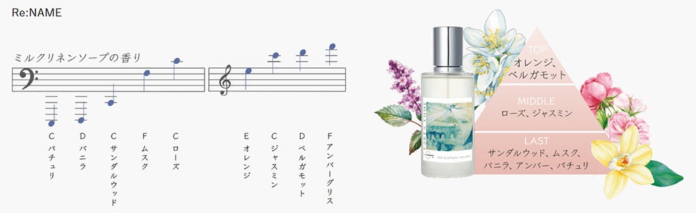 大塚 愛さんの楽曲、『un』『ゾッ婚ディション』『Re:NAME』に使われている音を複数セレクトし、「香階」の手法を用いて、その音に紐づく香料を調合することで、各楽曲ならではの香りを作り上げています。『un』はスパイシー・ウッディの香り、『ゾッ婚ディション』はホワイトフローラルの香り、『Re:NAME』はミルクリネンソープの香りといった、個性豊かな香りが誕生しました。