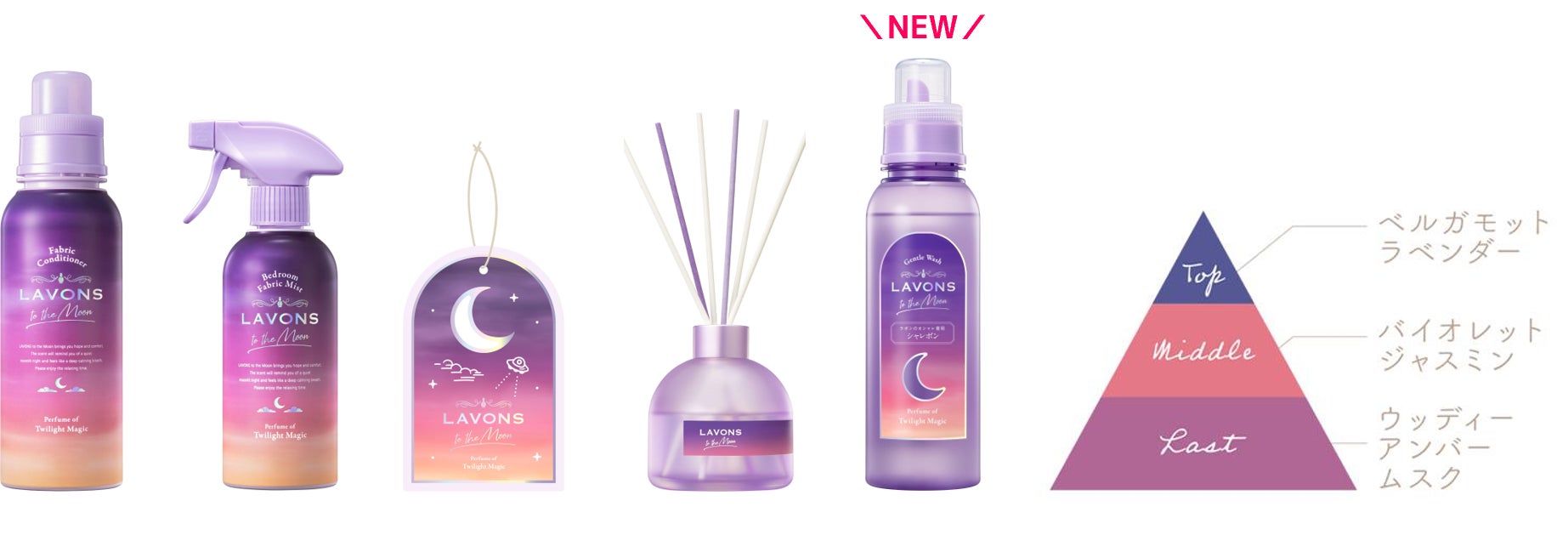 Well Being(ウェルビーイング)ニーズの高まりを背景に「ラボン」から発売された『ラボントゥザムーン』シリーズ。クリアなアンバーとやさしいシトラスが調和した「トワイライトマジックの香り」と、やわらかなサンダルウッドと神秘的なアルモワーズが織りなす落ちついた「ノクターナルブルーの香り」。深呼吸したくなるようなリラックス体験を提供する、2種類の香りを楽しめます。