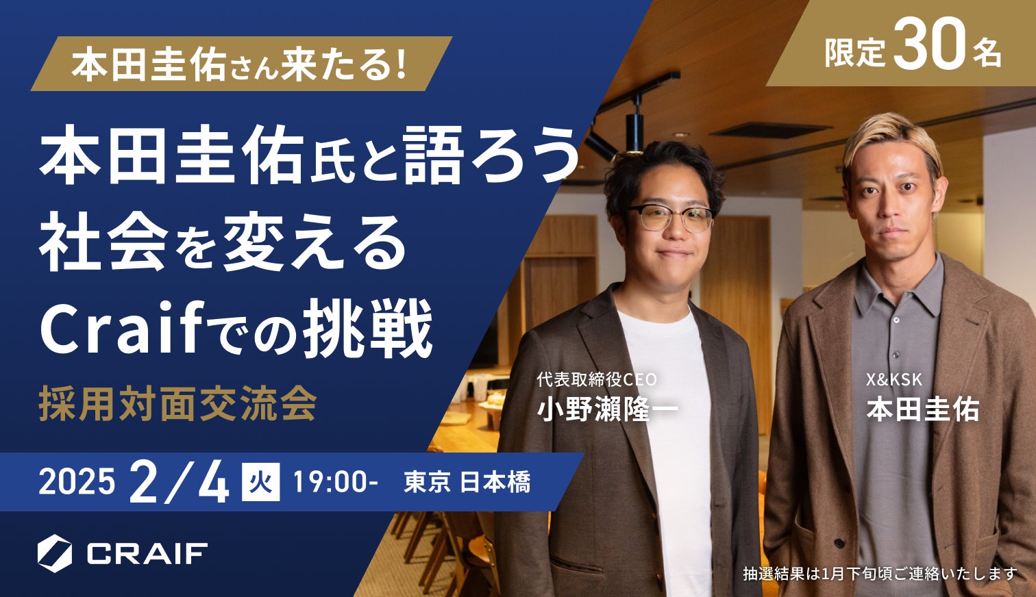 先日発表したシリーズCの資金調達を機に、採用のさらなる強化を図るCraifではX&KSKを率いる本田 圭佑氏を招き、30名限定の採用対面交流会を開催いたします。