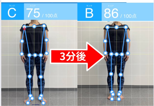 実際に、逆足スタートで3分間歩いた体験者は、全体的に右に傾いていた姿勢が改善。AI姿勢分析システム「Posen」のスコアも改善しました。