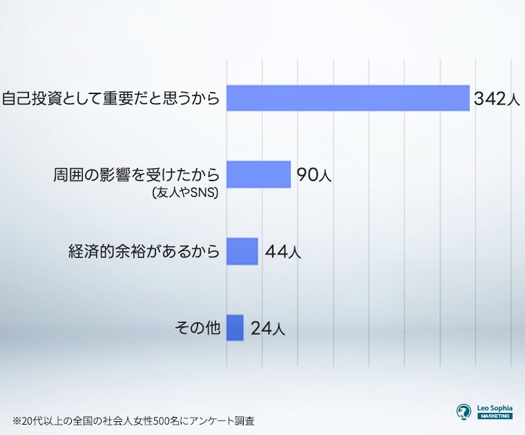 美容医療への支出理由として、「自己投資として重要」という回答が圧倒的多数を占めました。中でも、コンプレックスの解消や年齢に伴う悩みの改善、結婚式等のライフイベントに向けた自分磨きとして活用しているという声が多くありました。