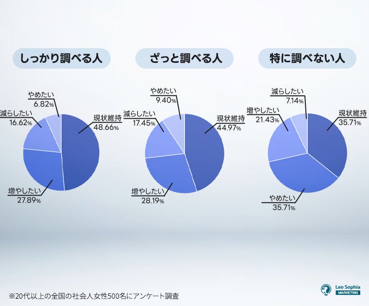 「しっかり調べる」人の多くは満足度が高く、継続して美容医療に投資したいと考える人が7割以上いる一方で、「特に調べない」人は一度の失敗体験から「やめたい」と美容医療そのものを敬遠していることが分かりました。
