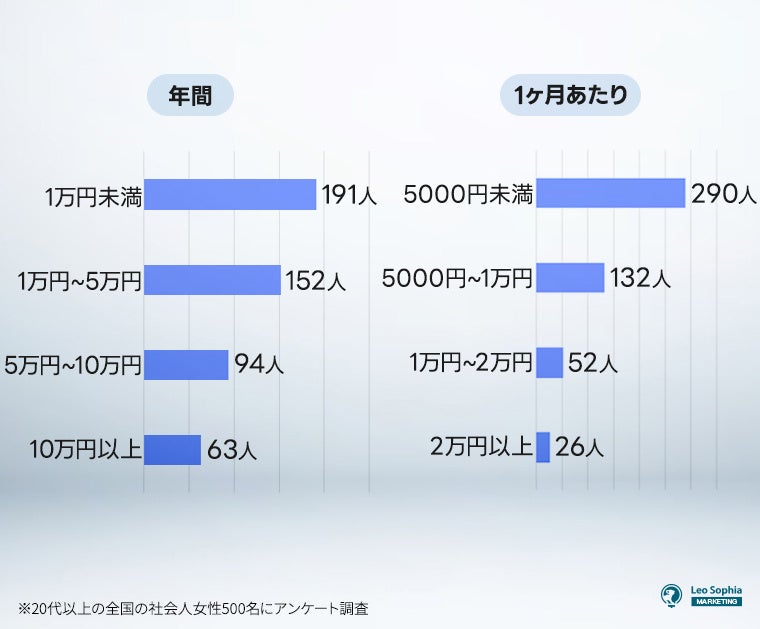 アンケートの結果、社会人女性の美容医療にかける年間支出額は「1万円未満」(191人)が最も多く、次いで「1万円~5万円」(152人)が続きました。これは、整形だけでなくエステといったライトな施術が広がり、手軽に美容医療を受けられる環境が整っていることが背景にあると考えられます。