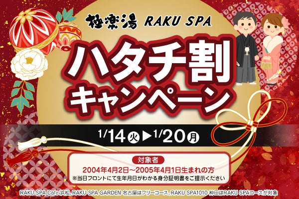 株式会社極楽湯(本社:東京都千代田区、代表取締役社長:佐藤 剛史)は、2025年1月14日(火)~20日(月)まで極楽湯・RAKU SPAグループ27店舗で、「ハタチ割キャンペーン」イベントを開催致します。
