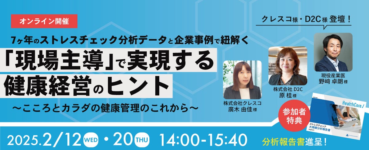 従業員の心身の健康を促進し、いきいきと働いてもらうためには、組織の現状把握と対策が不可欠ですが、健康経営を推進するご担当者様や産業医の方からは、「経営陣や管理職との連携がうまくとれない」などのお悩みを多く伺います。本セミナーでは、コロナ前~現在までの7ヶ年にわたるストレスチェック大規模分析データ調査をご報告。加えて、メンタルヘルス支援を専門とする産業医より、関係者を巻き込んだ新しい休復職者対策のご提案、さらに、企業ご担当者様の事例紹介を通じ、ご担当者がキーパーソンとなり、健康経営を推進するヒントをご紹介します。これからの時代の「ココロとカラダの健康管理」のポジティブな実現に向けて、効果的な取り組みを推進するための100分間です。