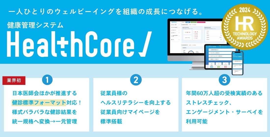 健康管理システム『HealthCore』は、従業員の健康データの一元管理や業務効率化の実現はもちろん、データを活用し、戦略的に健康経営を実践するための健康管理システムです。(開発:株式会社ヒューマネージ)。