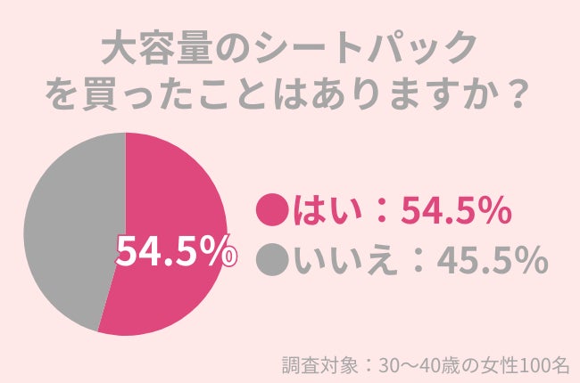 調査の結果、半分以上の女性が大容量タイプのシートパックを購入したことがあるとわかりました。大容量タイプのシートパックは、個包装タイプの商品と比べるとコスパが非常によく、ゴミもでにくいというメリットがあります。毎日シートパックを使用する方は、大容量タイプのシートパックを購入している方が多い傾向があるかもしれません。