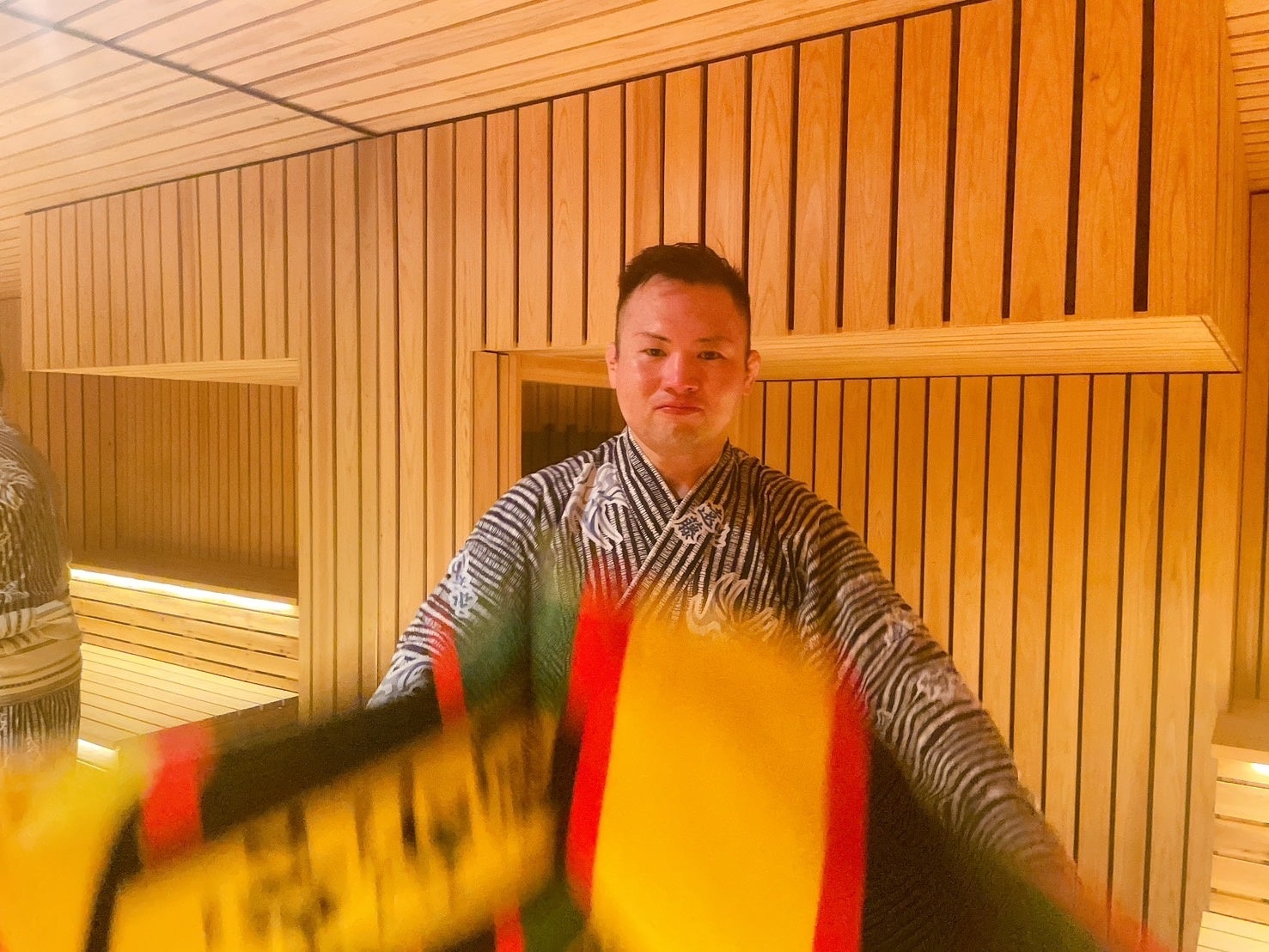 サウナ横綱の「稽古場サウナ」にある鉄砲柱で本格稽古の後はお客様へ特大タオルで熱波を送ります。