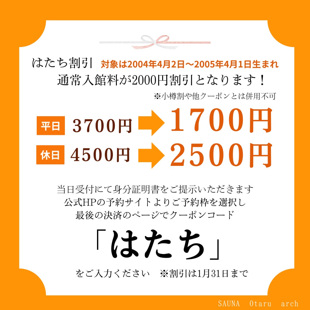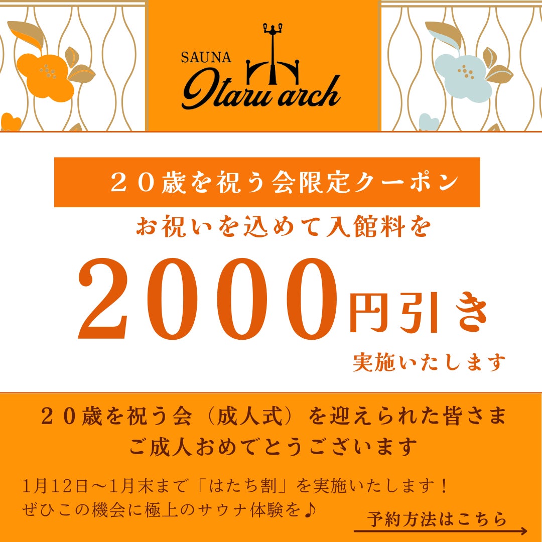 新たに「20歳」となられた方々にお祝いの気持ちを込めて開催!サウナ好きの方はもちろん、この機会にサウナデビューしてみませんか?1月12日~1月31日の期間限定クーポンを発行!