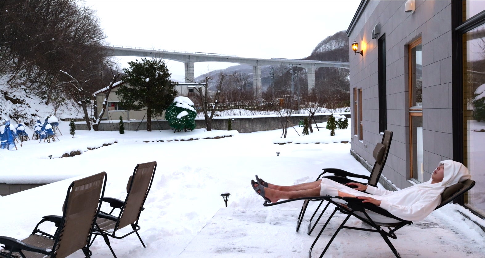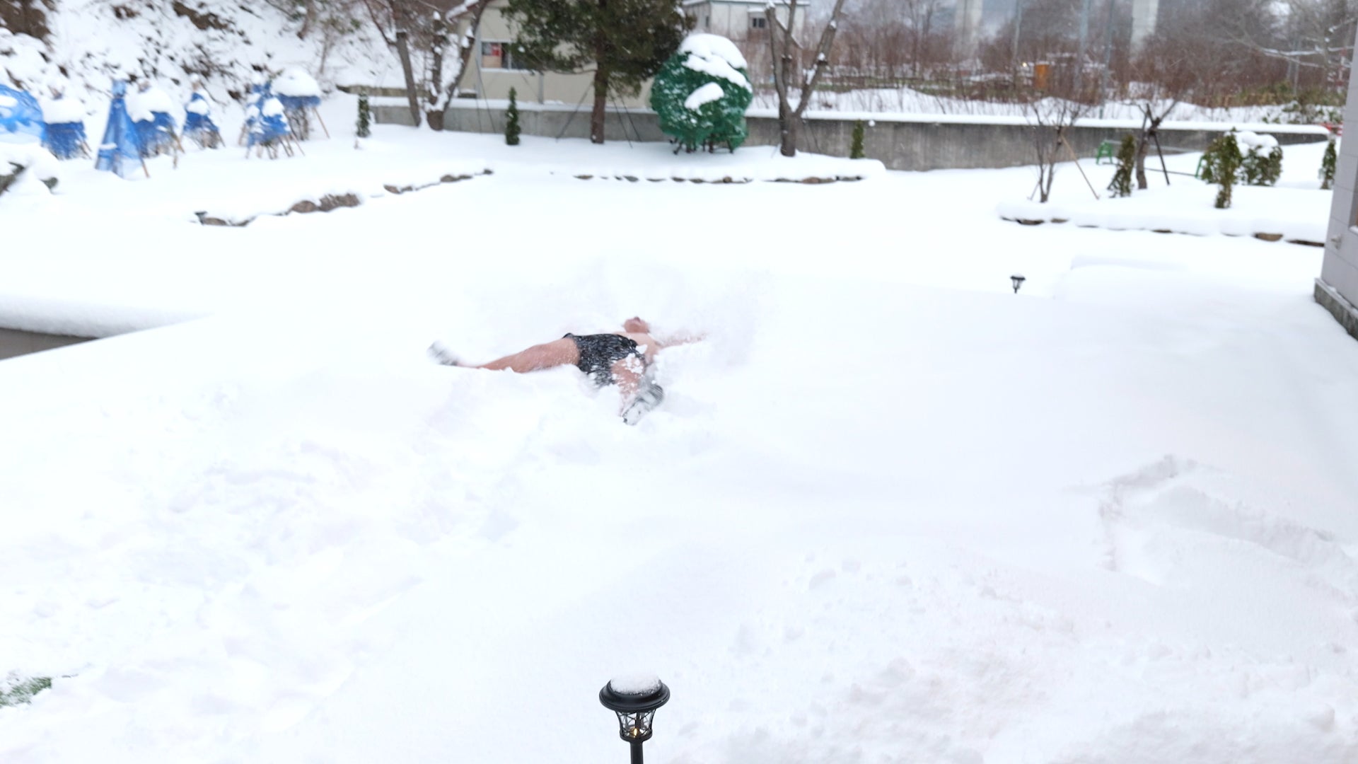 雪景色の北海道。サウナ―なら経験してみたい「雪ダイブ」。連日のように挑戦する方がいらっしゃします♪