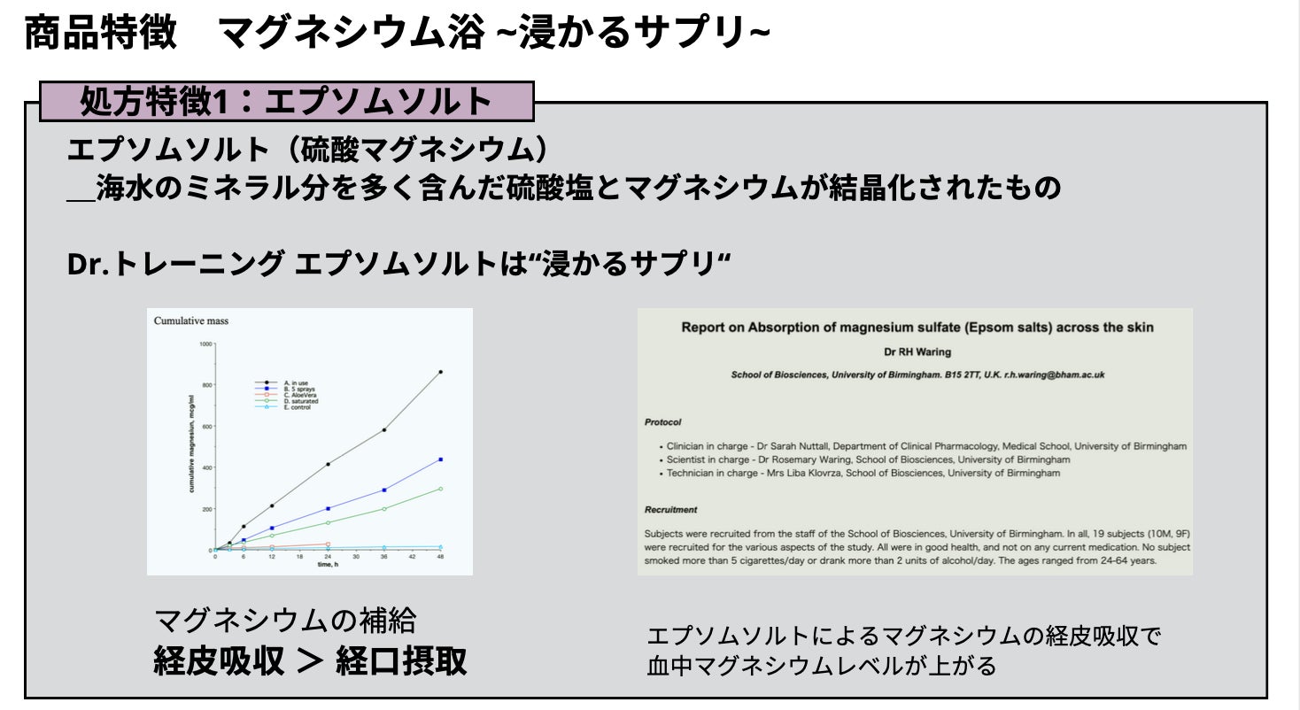 スポーツ医科学的根拠に基づいた「運動」「栄養」「休養」という3つの柱で健康を支えるDr.トレーニングは、「エプソムソルト」によってリカバリーを進化させました。「ただ癒すだけではなく、次に進む力を生む」リカバリーを提案します。