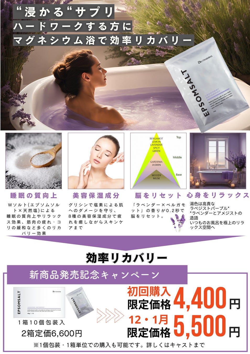 2025年1月、株式会社Dr.トレーニング(本社:東京都渋谷区恵比寿西1-30-1、代表取締役:山口元紀)は、運営するNutrition事業「Dr.トレーニングラボ」から、リカバリー入浴剤「エプソムソルト」を発売しました。