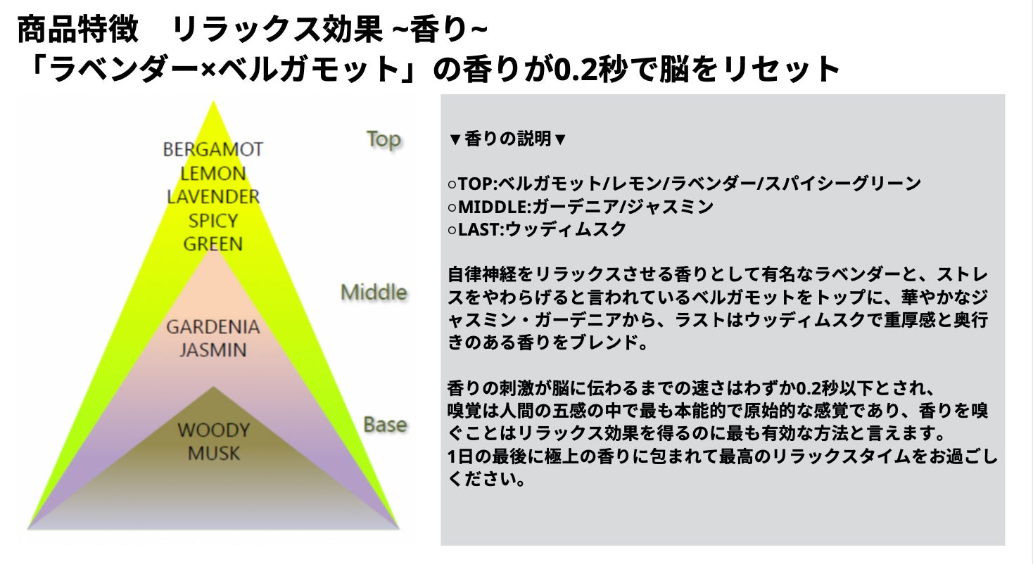 リラクゼーション効果で心と身体を解放し、質の高い睡眠をサポートします。