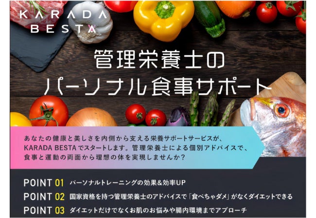 管理栄養士がユーザーの食事をオンラインで管理・アドバイスをするサービス「CHONPS」を運営する株式会社Nwith(本社:東京都中央区、代表取締役:福澤龍人、以下Nwith)は月額定額通い放題制パーソナルジム『KARADA BESTA』を運営するRILISIST株式会社(本社:東京都目黒区、代表取締役:黄 皓)と提携し、管理栄養士によるパーソナル食事サポートを開始します。