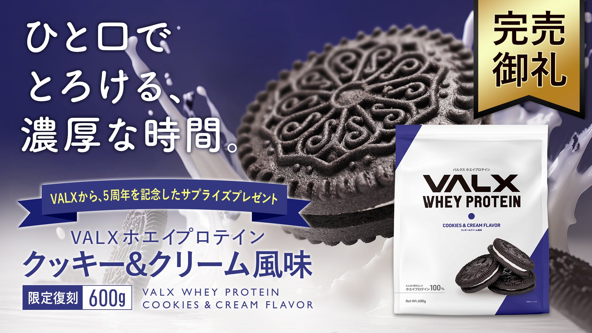 2023年の冬に限定フレーバーとして販売していた「VALX ホエイプロテイン クッキー&クリーム風味」は、完売を惜しむ多くのお声をいただき、VALX5周年を記念して2024年12月に限定復刻販売を行いました。