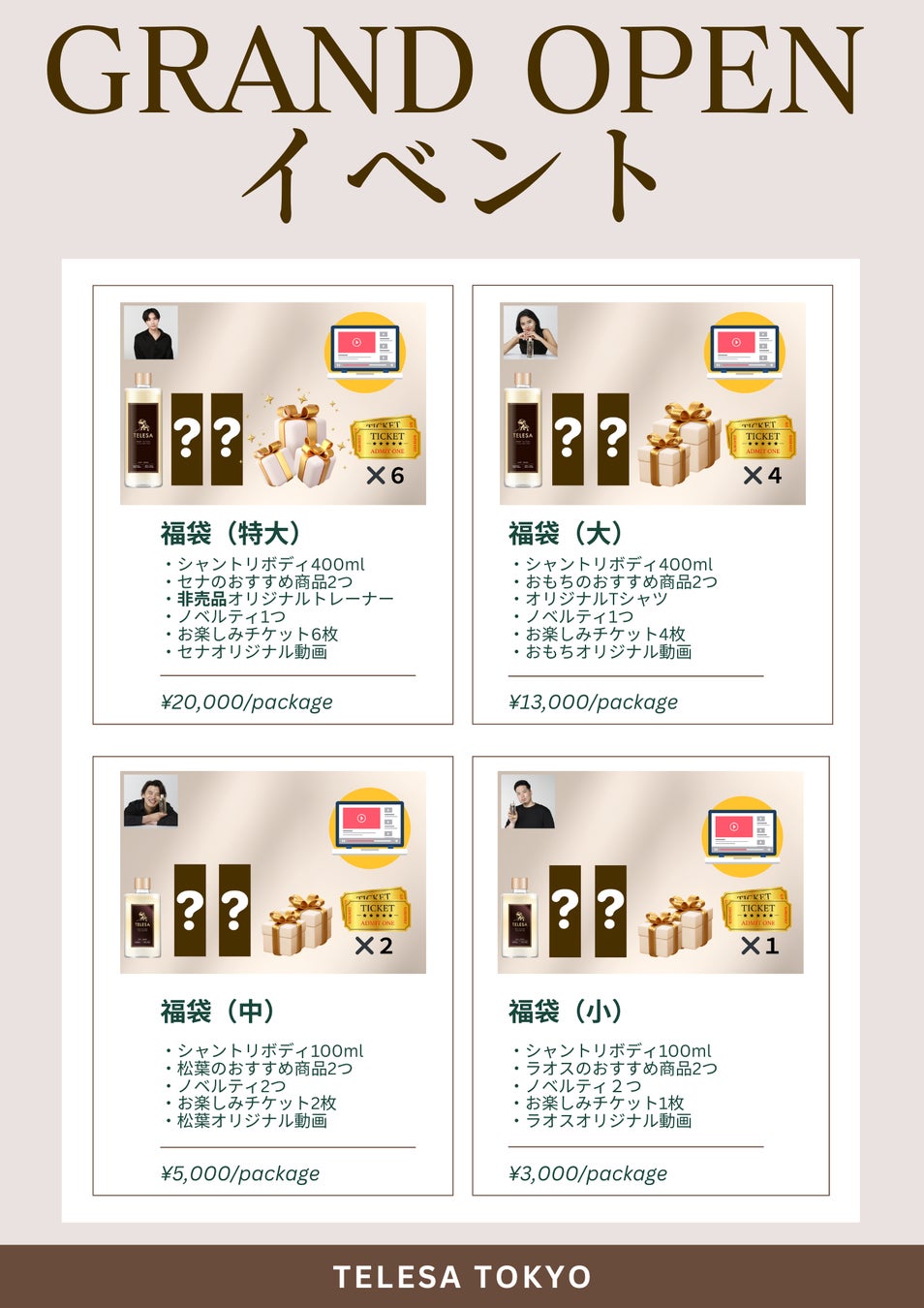 車谷セナ、松葉、おもち、ラオスの4人のおすすめ商品や非売品が入った、ここでしか買えない福袋をご用意しております。福袋を購入された方には、必ずシャントリボディとTELESA本社で開催するオフ会の参加権が当たる抽選券が付き、さらに各役員にちなんだシークレット動画もお楽しみいただけます。