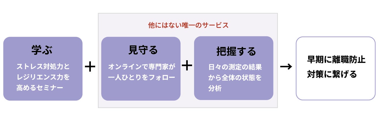 「レジリエンス力」を高め、「社会人としてのメンタルの基礎づくり」を支援し、早期の休職や離職を防止します。
