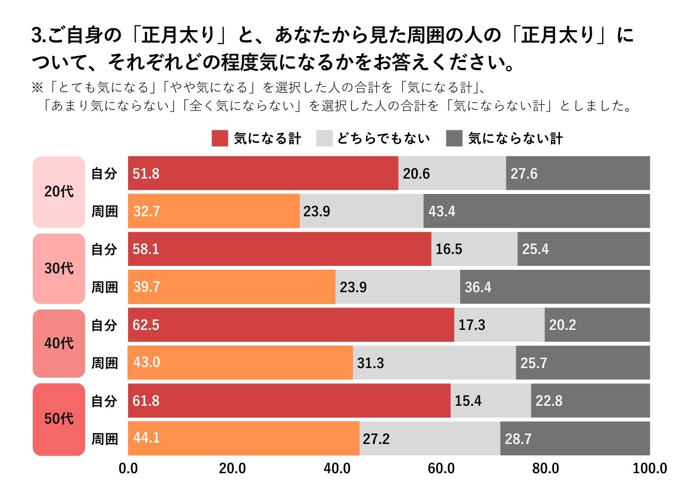 20代は、自分の正月太りは気になるけど、周囲は気にしない? 40代・50代では自分の正月太りが気になる割合が6割台、周囲も気になる割合が4割台