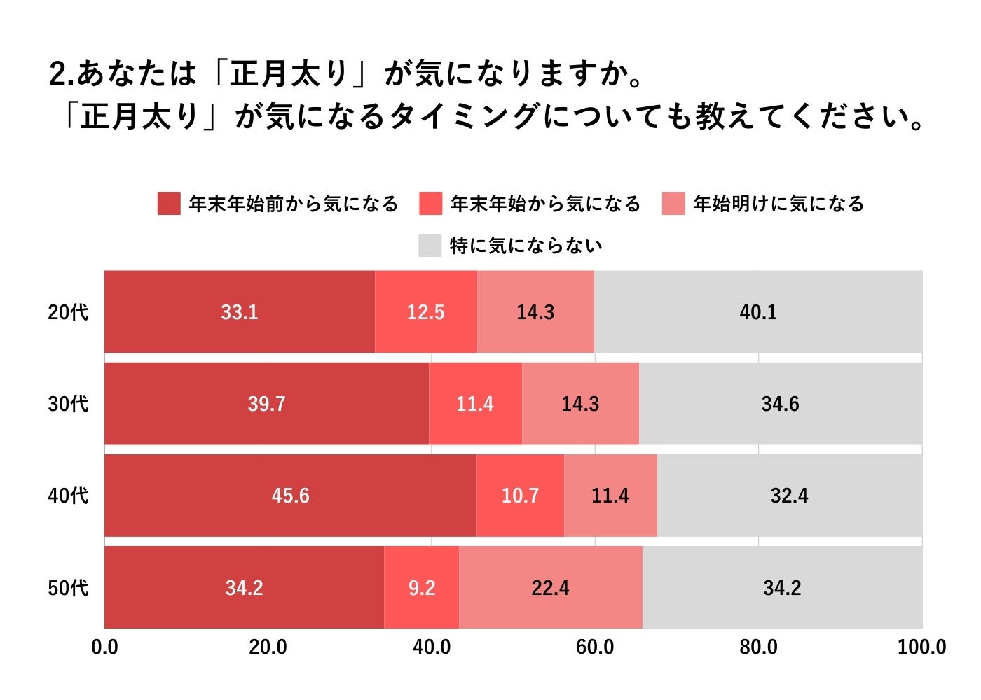 40代では「年末年始前から気になる(45.6%)」と回答した人が全年代で最も多く、30代(39.7%)と共に、早い段階から気になっている人がやや多いようです。