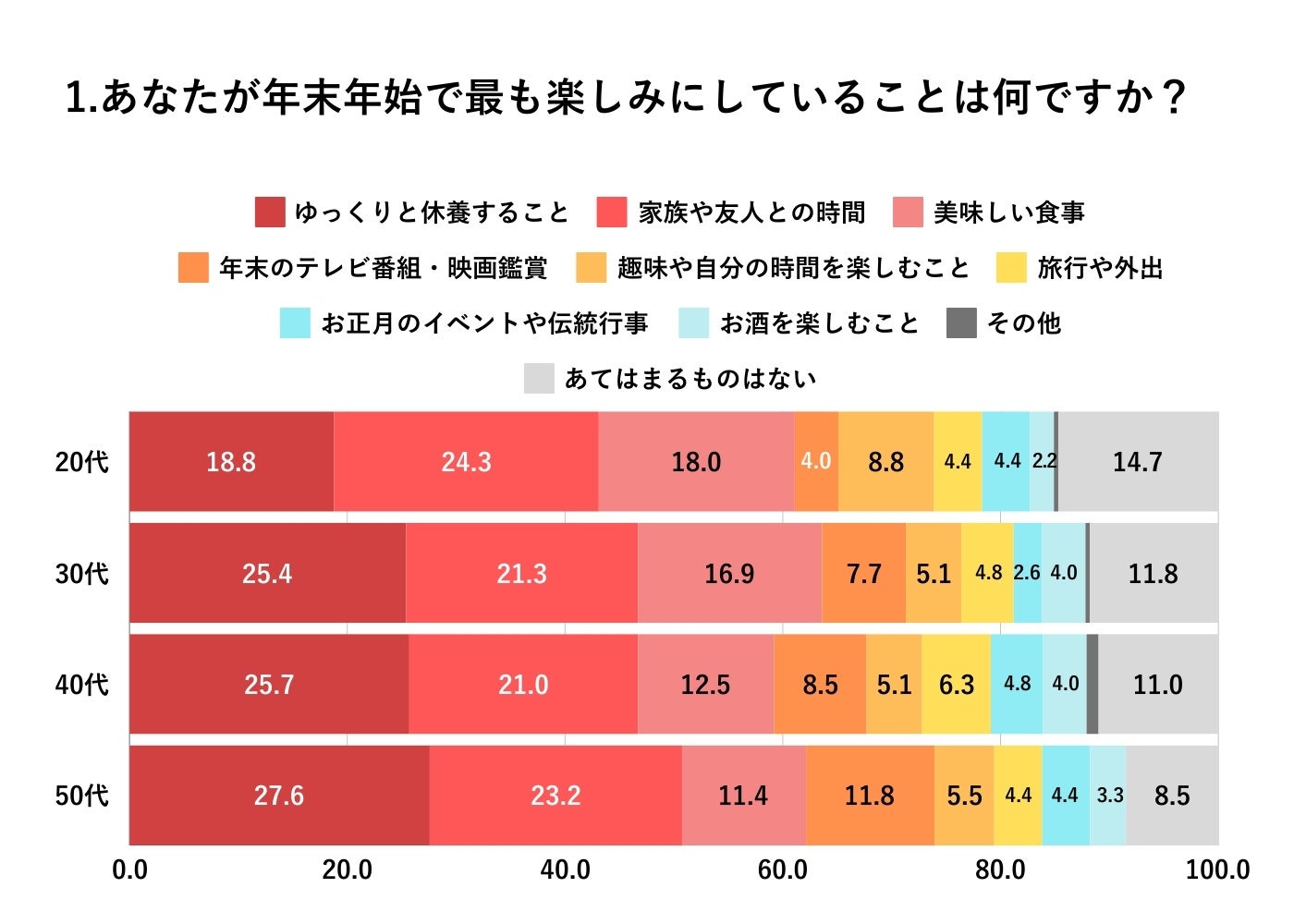 年末年始で最も楽しみにしていることは、20代では『家族や友人との時間』、30代以降では『ゆっくり休養すること』