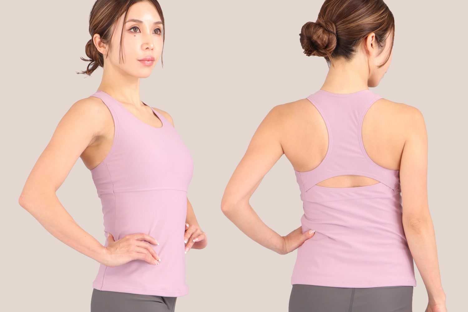 一般的なヨガやフィットネスのウェアは、ウエストを出した露出度が高いものが多くあります。そのなかで、このヨガウェアは、ウエストを隠したトップス丈の長いデザインで、初めてヨガウェアを購入する人にも手に取りやすくなっています。