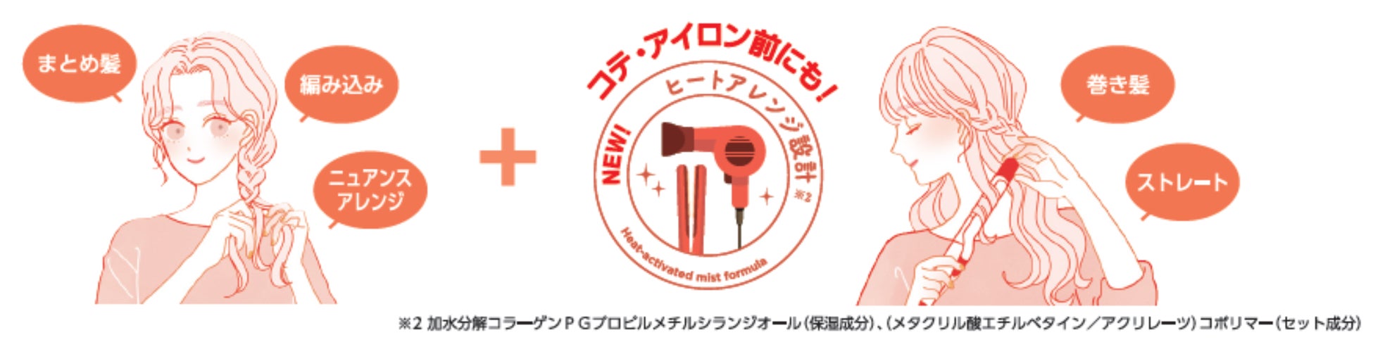 そこでカールキープ力がきちんと発揮できるように、ヒートアレンジ設計※2を採用。髪表面に皮膜を形成することで、ドライヤーやコテなど熱の力を味方にヘアスタイルをキープします。