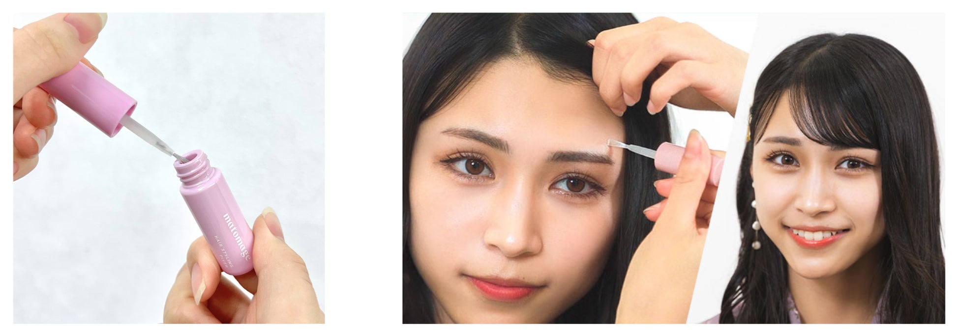使用方法:前髪をとめたい部分(肌)にグルーを塗布し、乾ききる前に前髪と肌を接着してください。