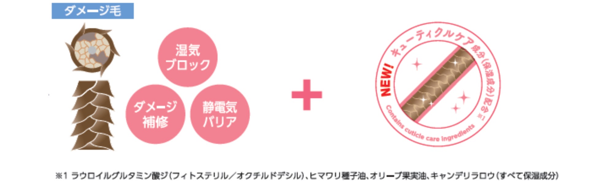 ①キューティクルケア成分※1を新たに配合し、あほ毛の原因となるダメージをケア